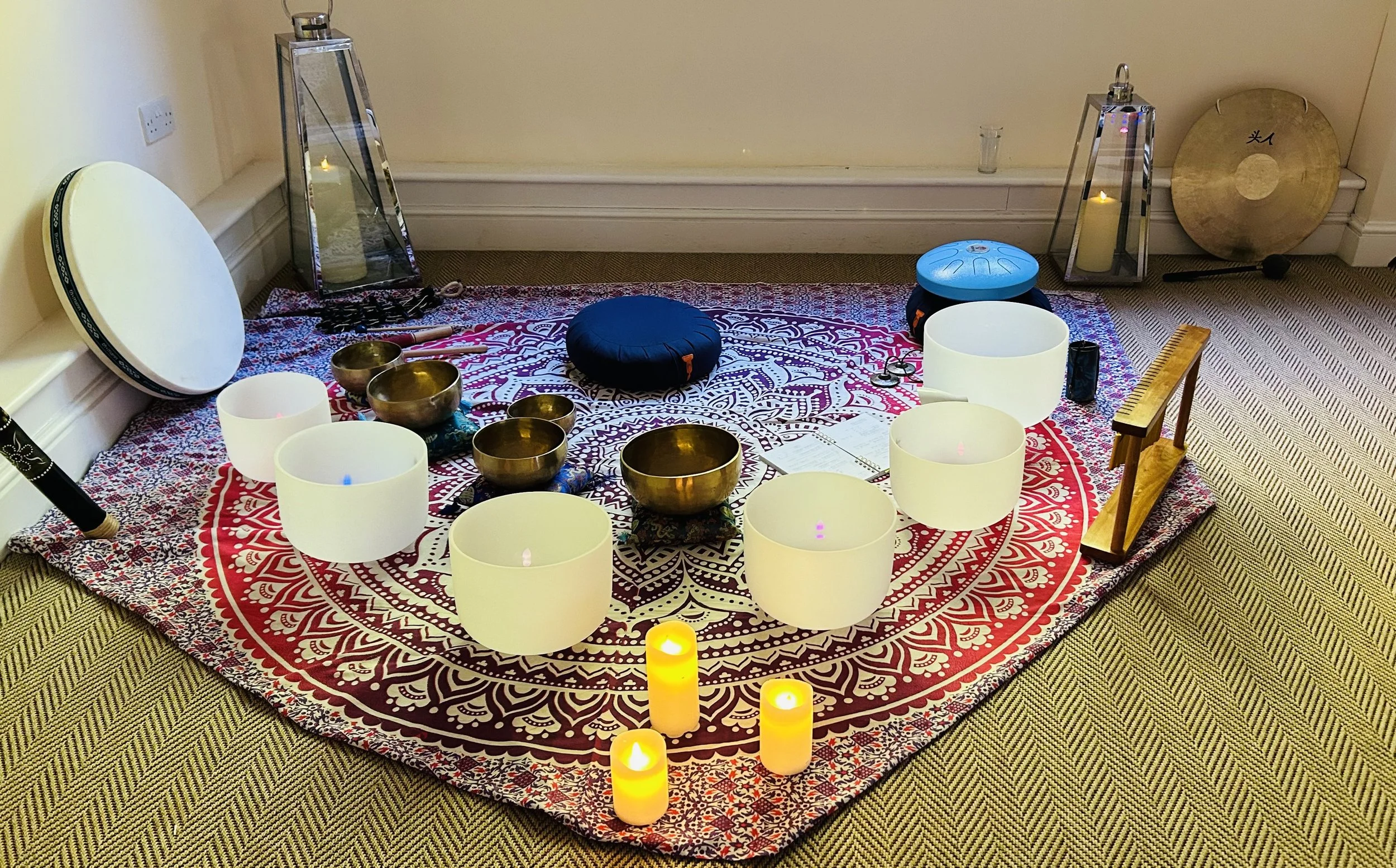 You will enter into a warm, candle lit room and lie down on a slim futon with a bolster under your knees. Gentle music will be played as you set your intention for your own healing, change & transformation. I will ask you to keep this intention loosely in your mind as you receive the healing sounds.